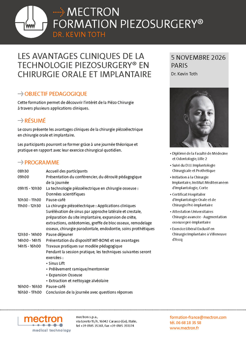 Découvrez le programme de formation Mectron. Accompagnés par nos conférenciers, vous apprendrez à maîtriser les techniques PIEZOSURGERY® et prophylaxie à l’aide de protocoles clairs et précis, applicables immédiatement au cabinet. Découvrez notre calendrier, choisissez la thématique, le lieu et la date souhaitée et inscrivez-vous au plus vite.